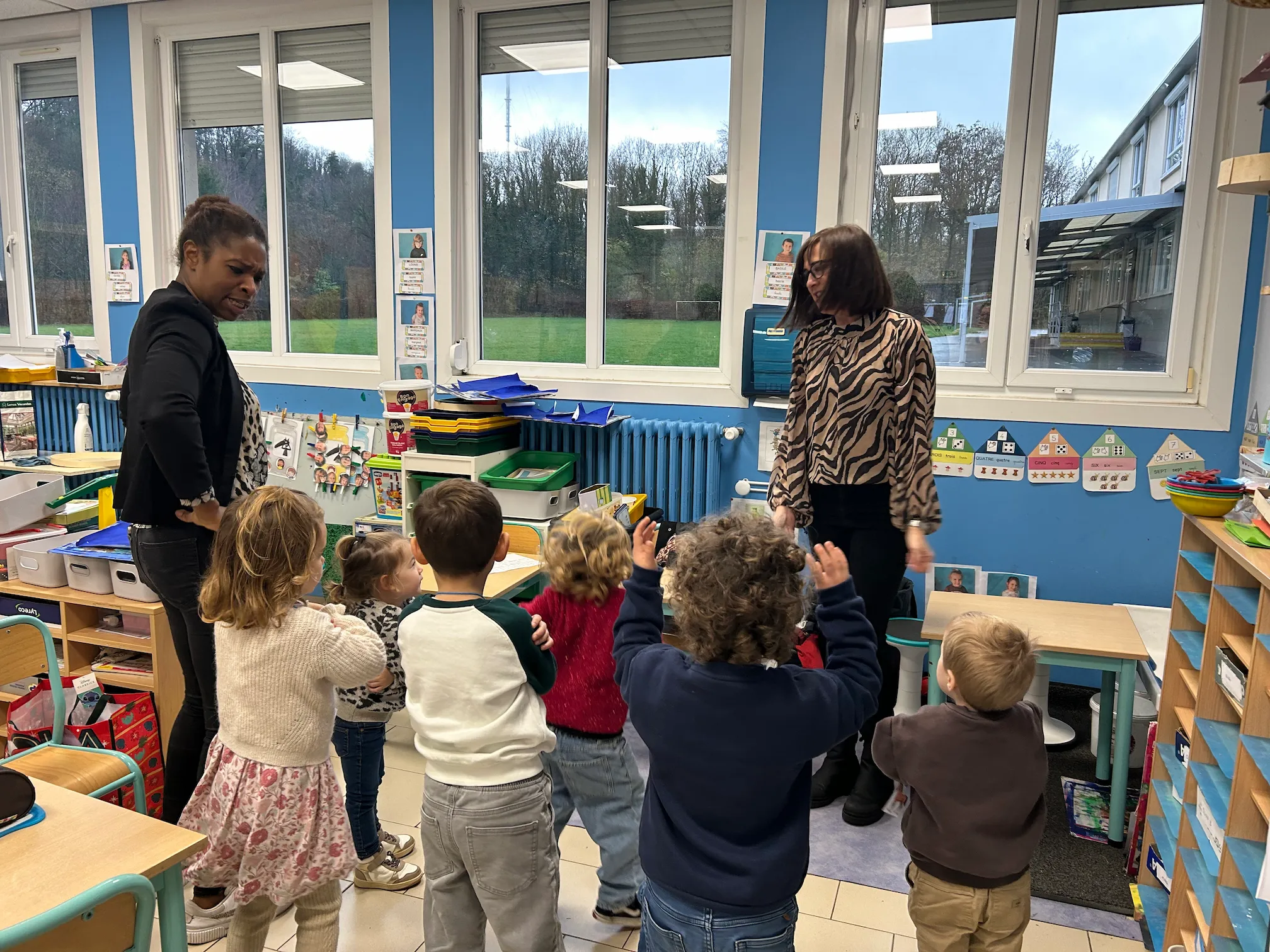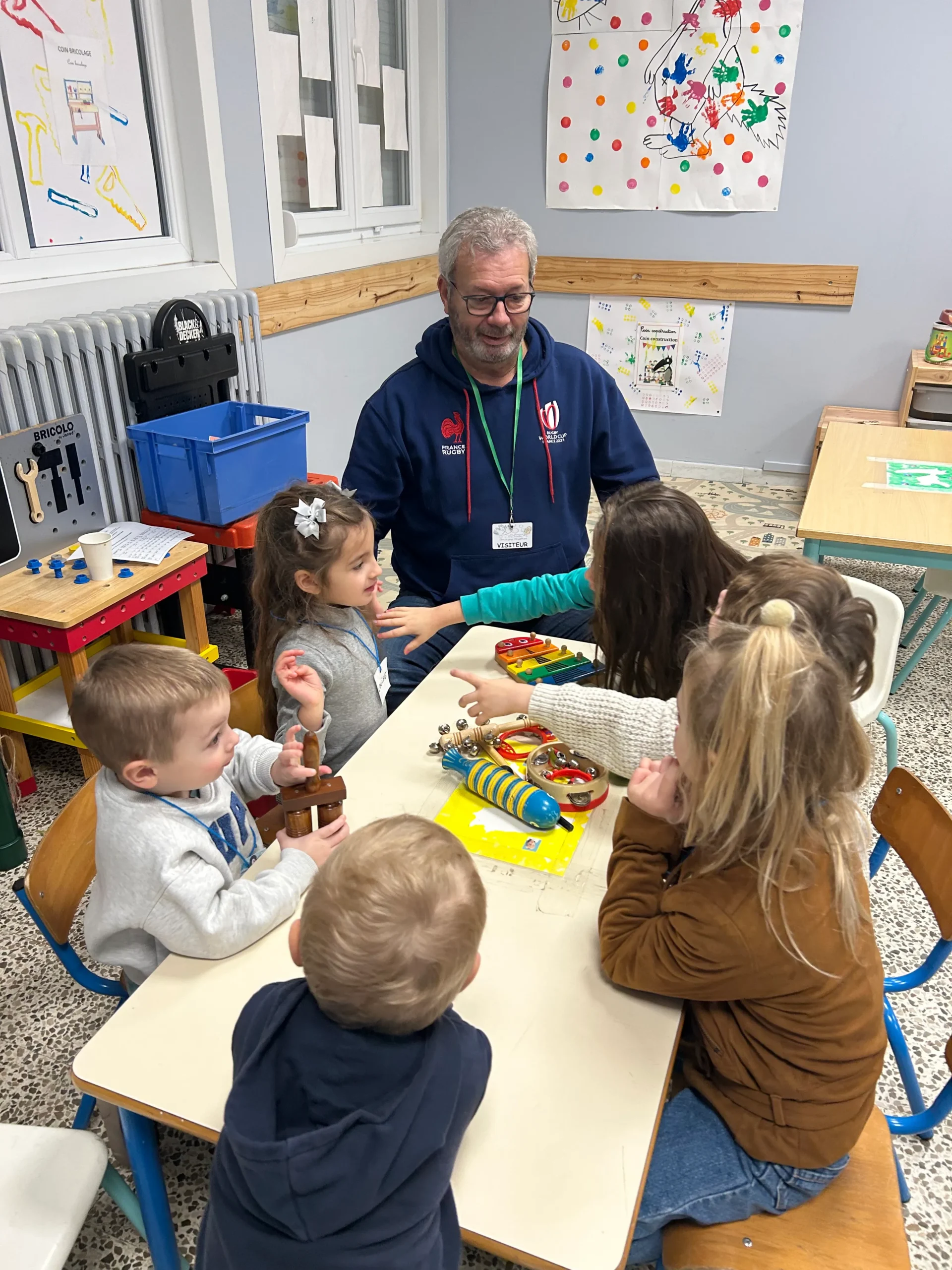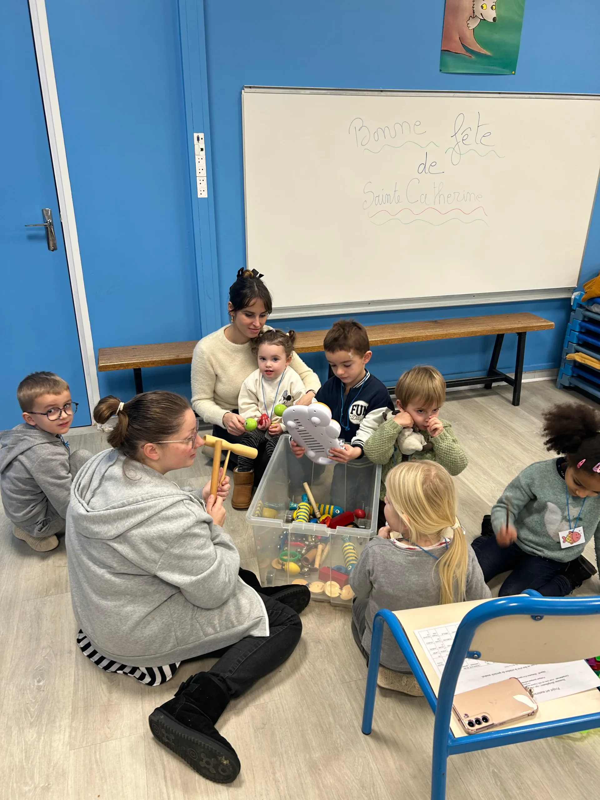 Chaque mardi , des parents accompagnent et encadrent avec les enseignants des ateliers découverte en musique. Une belle façon de développer l’écoute, le rythme et le chant.