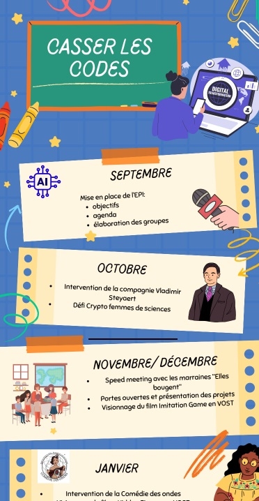 Cette année avec cet EPI, la lumière est mise autant sur les femmes de sciences que sur la cryptographie et l'art de coder et décoder les messages. Cet EPI est l'occasion d'en apprendre un peu plus sur Alan Turing et son test de Turing, test en plein dans l'actualité avec la montée de l'IA. C'est là encore l'occasion de parler de la machine Enigma, rencontrée l'an dernier au hasard d'une visite lors du voyage en Loire Atlantique et de comprendre comment les mathématiques ont permis d'aider à arrêter la Guerre. Et bien sûr en filigrane toujours cette volonté de rendre visibles les femmes en sciences, parce que peut-être il est plus facile de casser les codes que de casser les préjugés...